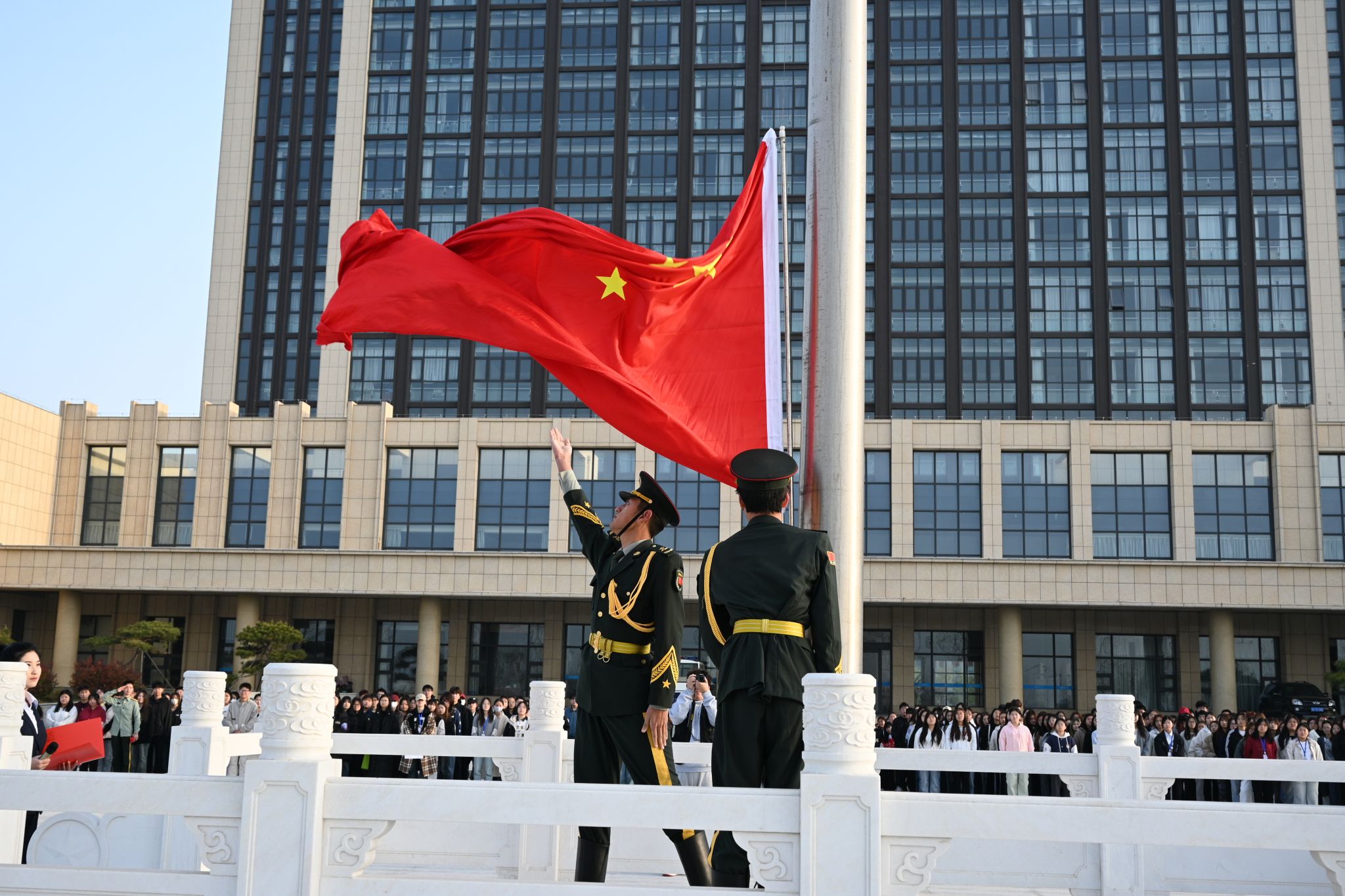 早晨7点,升旗仪式的正式开始。英姿飒爽的国旗护卫队迈着整齐有力的步伐护送国旗走向升旗台,鲜艳的五星红旗迎着朝阳缓缓升起,同学们庄严肃立,表达对祖国的无限热爱与崇高敬意。接着,辅导员老师代表和员工代表开展国旗下讲话,勉励同学们要铭记革命先烈的光辉事迹,将他们的精神内化于心、外化于行,用实际行动践行青春誓言,为祖国的繁荣富强贡献自己的力量。