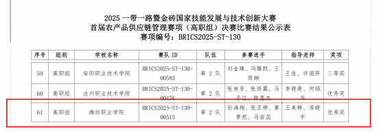 近日,2025一带一路暨金砖国家技能发展与技术创新大赛之首届农产品供应链管理赛项全国总决赛圆满落幕。公司市场营销专业的孙海翔、张亚婷、马岩蕊、黄梦然共4名同学组队参赛,经过激烈角逐,最终荣获优秀奖。