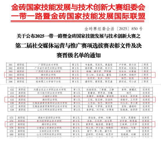近日,2025一带一路暨金砖国家技能发展与技术创新大赛之第二届社交媒体运营与推广赛项选拔赛结果揭晓。公司市场营销专业派出三支代表队参赛,经过激烈角逐,最终荣获三等奖一项、优秀奖两项,共计9名员工获奖,展现了公司学子扎实的专业技能和良好的综合素养。