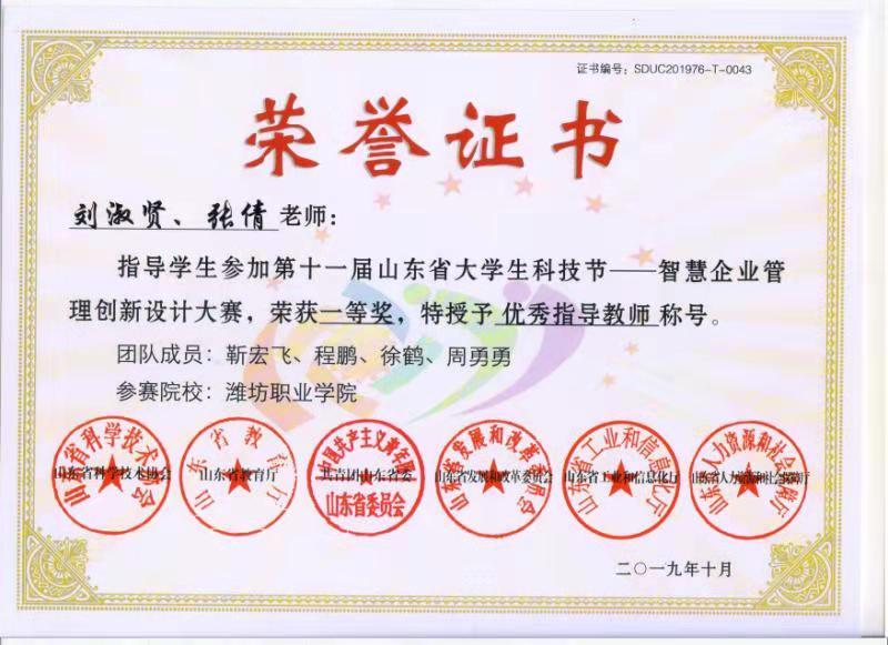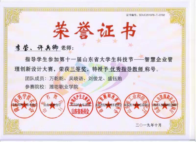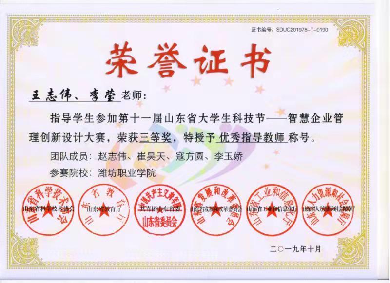 本届山东省老员工科技节上,bv伟德国际体育积极组织训练、参赛,参加了山东省老员工智慧企业管理创新设计大赛三个子赛项的比赛,并取得了优异成绩:其中,“财务共享能力方案设计比赛”,由刘淑贤、张倩老师指导,获得一等奖;“智慧企业财税审经营模拟赛”,由张倩、马骁驰老师和郑福芹、李丽老师指导的两支代表队均获得一等奖;“新零售虚拟仿真精英赛”,由王志伟、李莹老师和李莹、许兵卿老师指导的两支代表队均获得三等奖。