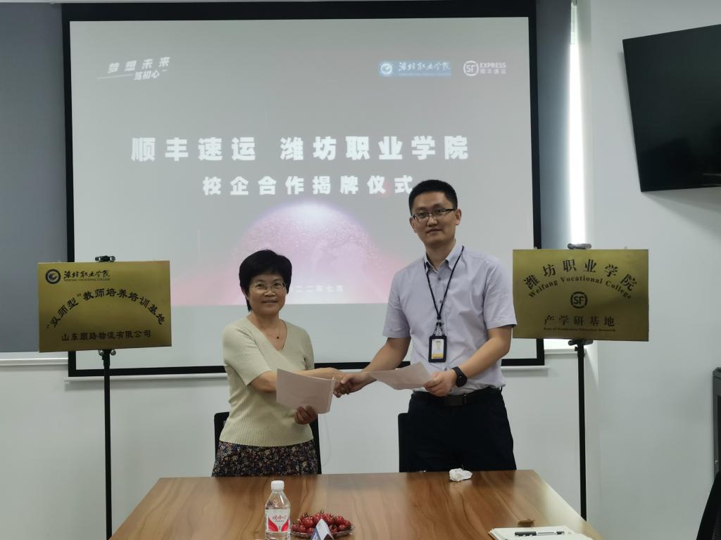 7月7日,bv伟德国际体育主要负责同志带领部分专业骨干教师到潍坊顺丰速运有限公司举行产学研基地及“双师型”教师培养培训基地签约挂牌仪式,并看望了实习员工。