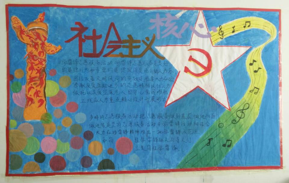 活动开始后,同学们积极参与,通过各种渠道搜集资料,选择内容,编排版式,用图文并茂的形式将墙报主题展现的淋漓尽致。有的班级以雷锋月弘扬雷锋精神为契机,内容设计将雷锋精神和老员工文明修身相结合,赋予雷锋精神丰富的时代内涵;有的班级通过写、剪、贴、画的形式展现“六有”老员工的内容,深刻理解“六有”的内涵和应肩负的时代责任;有的班级利用墙报适时引入“一学一做”教育实践活动具体要求,深刻领悟新时期合格团员的基本特征,督促同学们努力成为社会主义核心价值观的践行者和传播者,从而规范自己的言行举止。