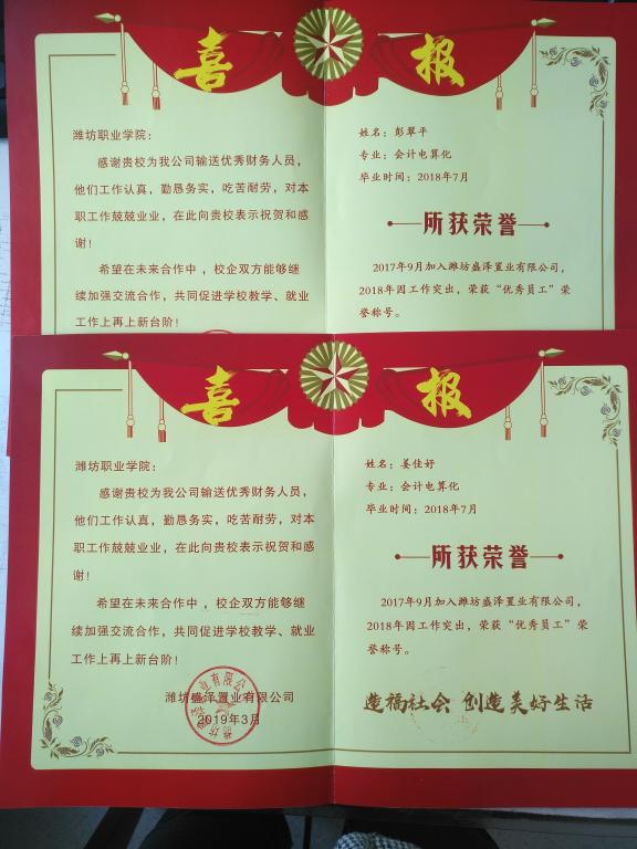 3月25日,山东盛泽置业有限公司送来喜报,bv伟德国际体育会计专业2名毕业生荣获山东盛泽置业有限公司2018年度 “优秀员工”荣誉称号。