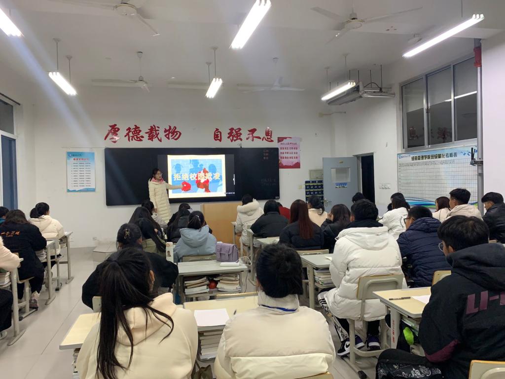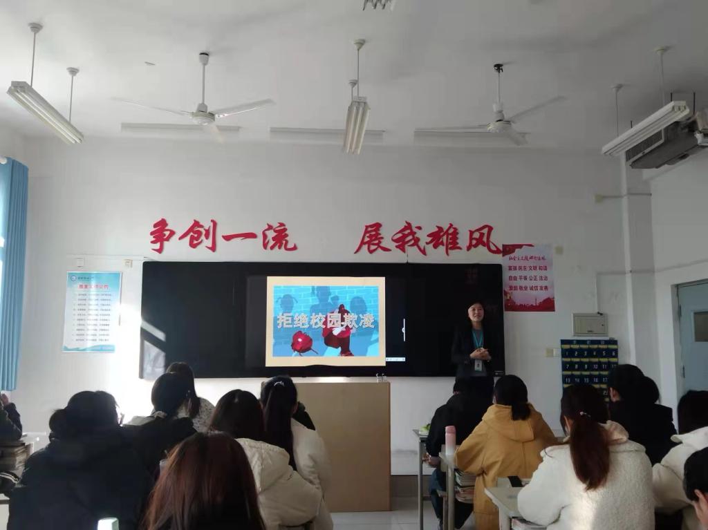 主题班会上,首先,各班主任利用多媒体,以典型案例的方式导入,深入浅出地讲解了什么是“校园欺凌”、如何预防校园欺凌事件、遭遇校园欺凌时应该采取的应对措施等。其次,通过视频、图片、文字,直观、形象地展示了校园欺凌给受害者带来的伤害及严重后果,并结合最近我们身边发生的事例、网络报道等,进一步引导员工深刻了解校园暴力的危害,告诫同学们面对校园欺凌要做到不实施、不参与欺凌和暴力行为,学会运用法律武器维护自身合法权益。