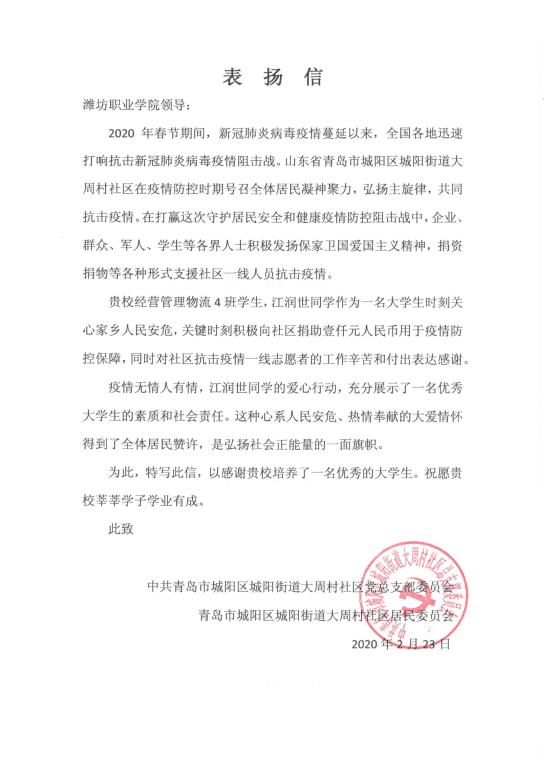 3月11日公司收到来自中共青岛市城阳区城阳街道大周村社区一封特殊的表扬信,2019级物流管理四班江润世同学向社区疫情防控无偿捐款壹千元人民币。他捐款的数目虽不巨大,却承载了爱的力量。在同学们眼中,他是善于助人的好朋友,当同学们有困难的时候,他总会会尽自己所能的帮助。