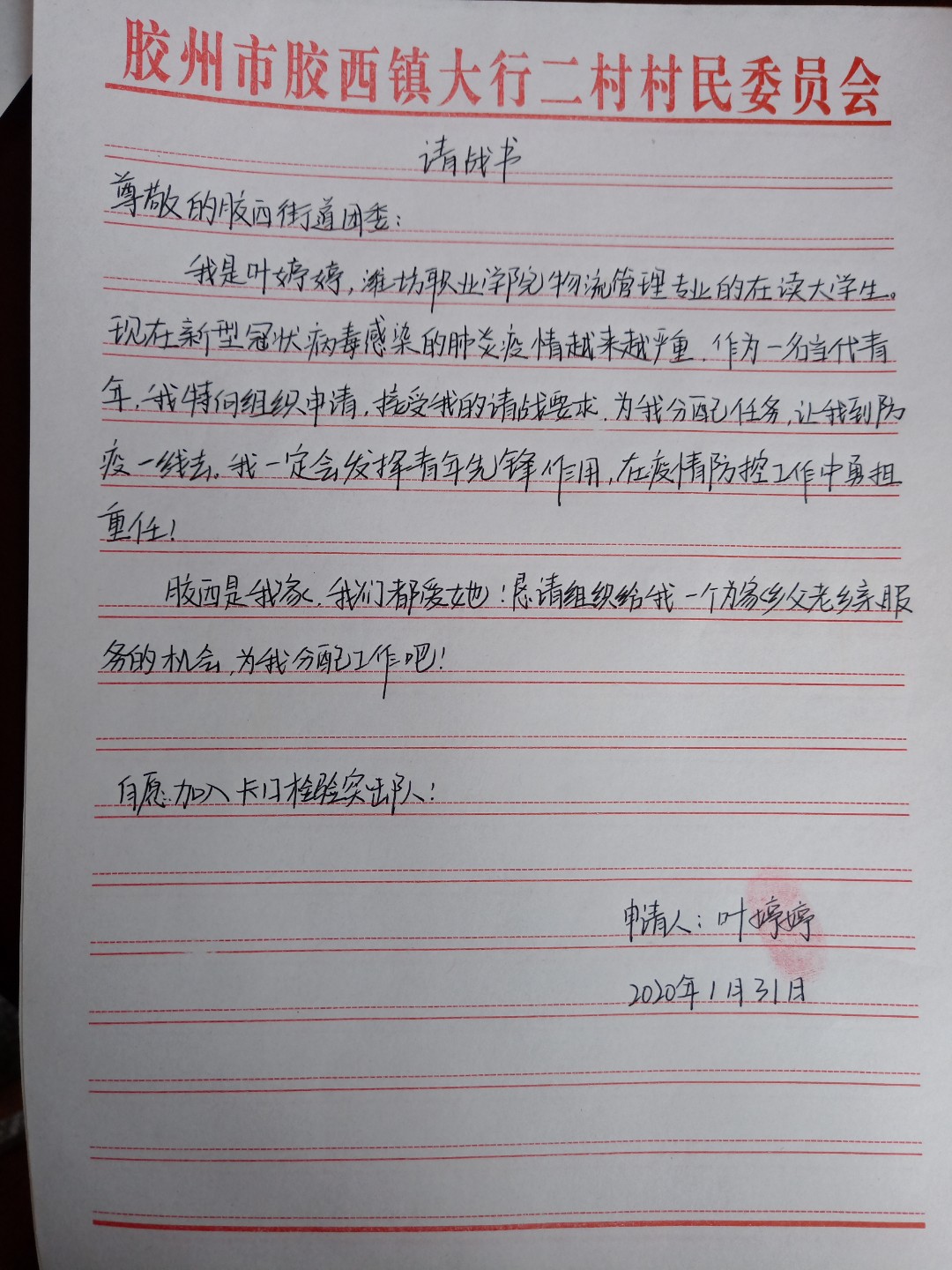 在这样一支庞大的志愿者队伍里,也有很多潍职经管青年的身影。有一分热,发一分光,远在各地的潍职经管人用不同的方式在此次抗疫行动中留下了爱与温暖,来自2018级物流管理1班叶婷婷同学就是其中的一员,1月31日她主动请战参加防疫工作,到村委会填写请战书,参加防控工作后,她每天在防控执勤点协助工作人员进行必要的信息登记和检测体温。他每天巡查村庄,对孤寡老人讲解疫情的相关知识,耐心做好小区人员的思想工作,告知在家隔离的必要性。对于有重要事情要外出的人员,她会反复叮嘱注意事项。“哪里需要,我就去哪里”在防疫工作中这是她的常态。她用自己的行动与责任感为抗疫行动贡献了自己的力量。